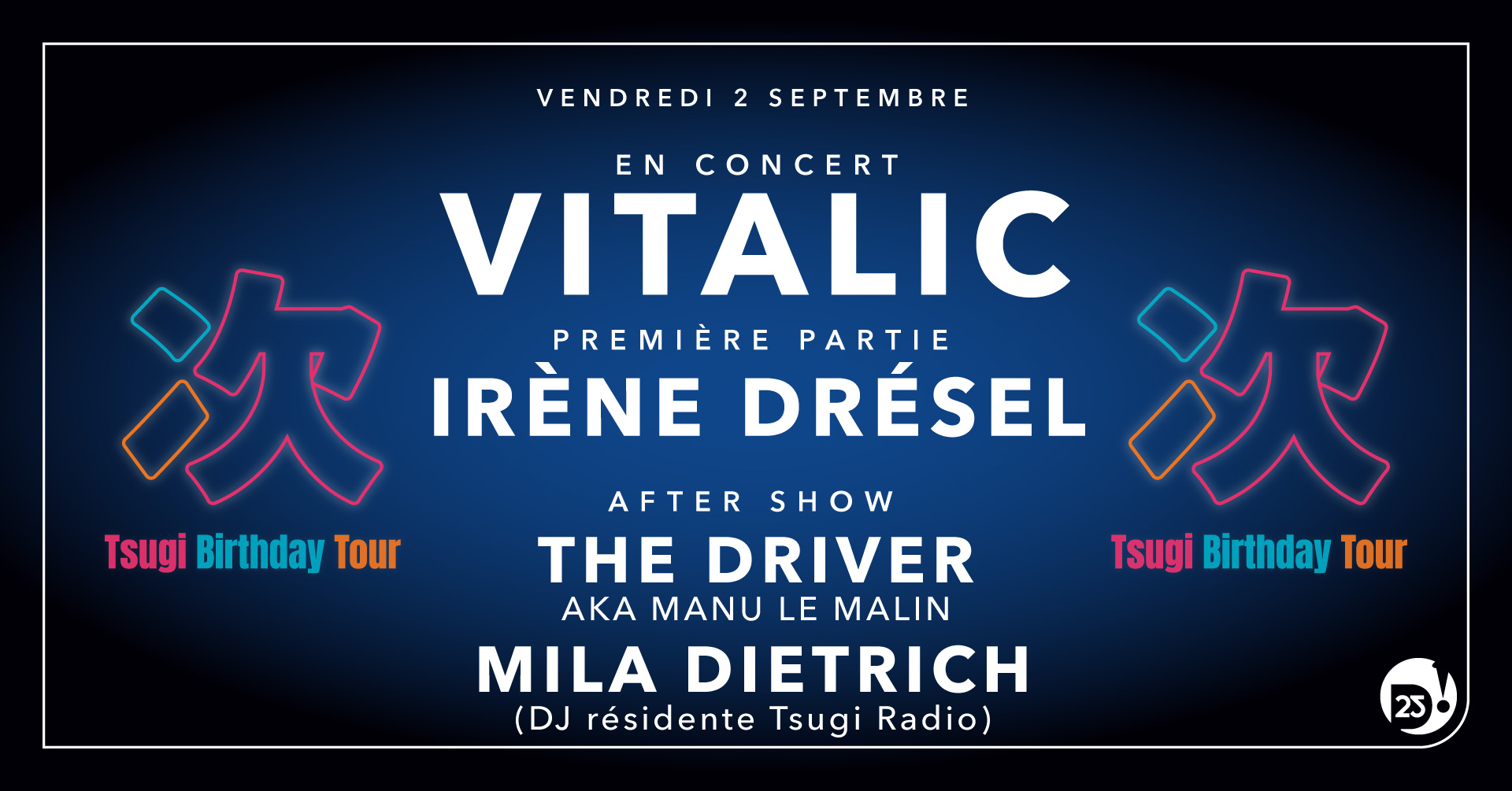 Club culte de la nuit suisse fondé en 1996, le D! Club a toujours su laisser une place de choix dans sa programmation à la fine fleur des artistes des musiques actuelles européennes. Une philosophie qui correspond parfaitement à notre ADN comme vous vous en doutez, et qui place le D! Club comme un partenaire historique de notre magazine. Alors, après un passage au Bikini à Toulouse dans le cadre du festival Electro Alternativ, cette seconde date de notre Birthday Tour se doit d’être réussie et gage d’une belle fête ! Pour le meilleur, on a donc mobilisé quelques uns des amis de Tsugi, à la fois côté magazine et côté radio. Au programme, Irène Drésel, The Driver aka Manu Le Malin, Vitalic et Mila Drietrich formeront le line-up de choc concocté pour fêter dignement notre quinzième anniversaire en Suisse romande, de 21 heures jusqu’au petit matin.