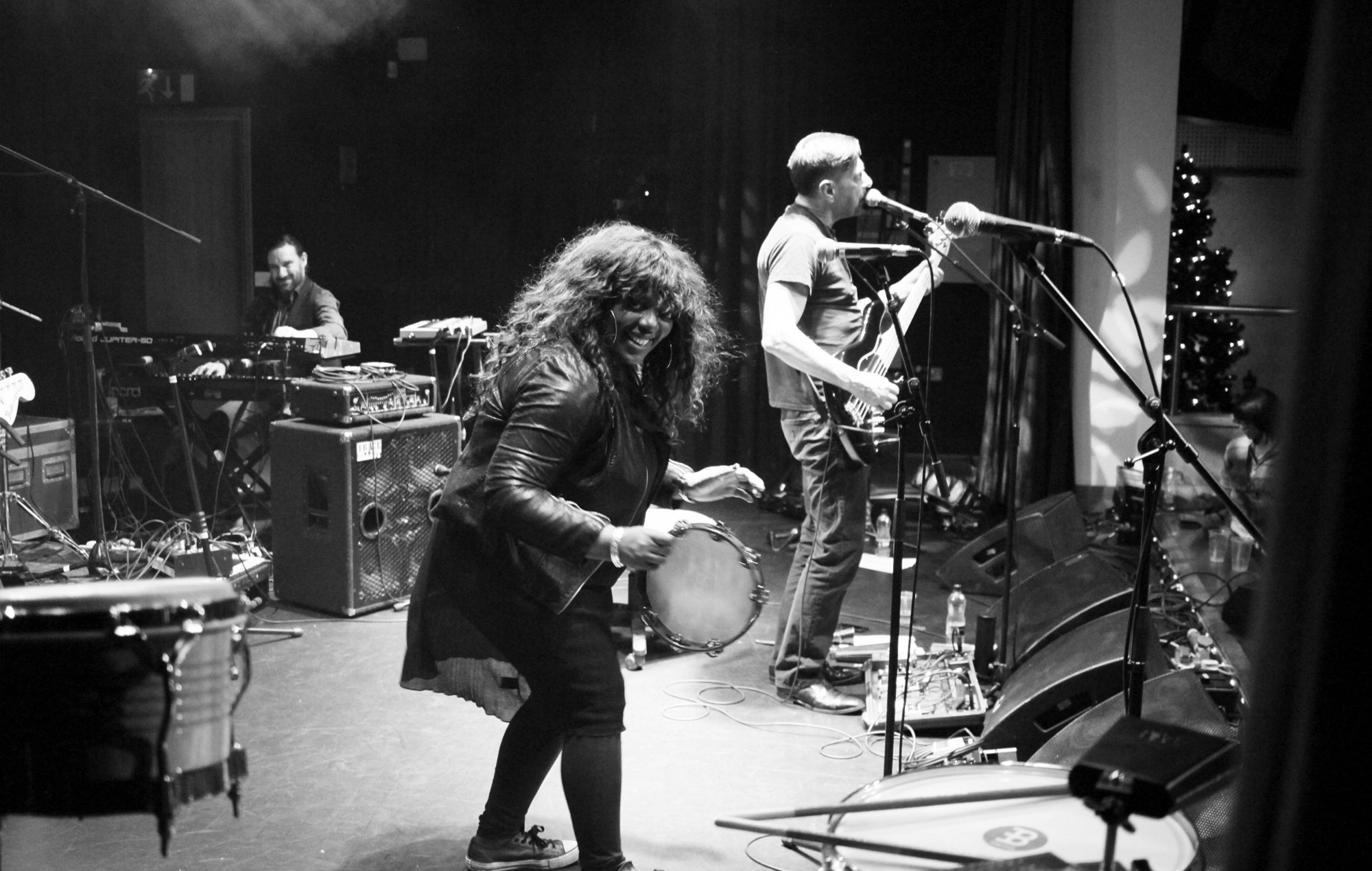 Jez monte devant afin de pouvoir étendre ses jambes ; depuis un an il souffre de sciatique, au point de devoir utiliser une chaise pendant les concerts, et ne plus supporter la position verticale qu’à coups de dose de cheval d’antalgiques. On s’assied à l’arrière  entre Donald Johnson, le batteur, et Denise Johnson, en demandant s’il y a un lien de parenté, mais non. Denise décrit plus volontiers le lien qui unit les six Ratios comme celui d’une “famille dysfonctionnelle”. Elle est pour sa part la caution solaire d’ACR. Une diva différente, sans chichis, qui leur prête sa voix soul depuis 28 ans, et qui s’invite aussi chez Primal Scream et New Order. Ceux qui croisent sa route et son sourire généreux la qualifient systématiquement de “ légende ”, mais Denise ne semble pas prendre tout ça trop au sérieux. Il n’y a guère que le rhum Wray & Nephew qui lui monte à la tête – même si, pour l’heure, on boit du café en savourant la vue sur les collines de Snowdonia. L’ambiance dans le van est calme et posée. Tony Quigley, le saxophoniste, finit sa nuit en toute discrétion. Diane, l’ingé son de haute-fidélité depuis 40 ans (également en charge des potards chez The Charlatans), lit The Silent Companions, ce qui résume assez bien l’ambiance du voyage. Jez fait le DJ en sourdine sur son iPad: Kraftwerk, Bowie, Brian Eno, Nico et les groupes avec lesquels ACR traînait pendant sa période 80’s new-yorkaise (Tom Tom Club, Tuxedomoon…) sont au cœur de ses playlists, comme ils sont gravés dans sa vie.Assis face à nous, Matt Steele, le nouveau claviériste, remplit des portées sur un cahier de musique. Depuis son premier live avec ACR en mai dernier, sa présence ne cesse d’amplifier la dimen-sion psychédélique des concerts. Jez est le premier à se réjouir de ce synth-man si apte à canaliser l’ailleurs dans ses claviers: “L’apport de Matt me permet d’essayer des trucs à la basse que je n’aurais jamais pu faire avant. C’est un plus considérable en termes d’espace et de créativité. »