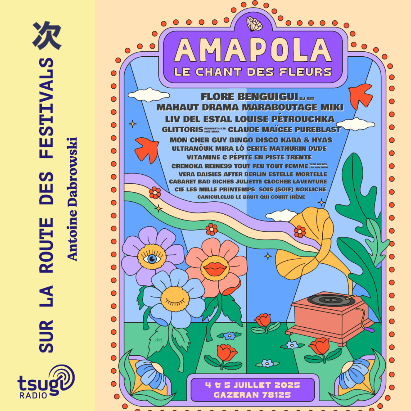 Retour à Gazeran, au Sud des Yvelines. Et oui, un autre département des Yvelines est possible, sans Gérard Larcher, Valérie Pécresse ou les cerfs-têtes de Versailles. Ici à Amapola, nous sommes entourés de champs cultivés par des agriculteurs bio, on se promène dans un petit bois magnifiquement scénographié, ici on fait la boum avec le Cabaret Bad Biches et ses créatures sublimes, drôles et attachantes et on danse jusqu’au petit matin en essayant de ne pas trébucher sur les troncs d’arbre. Ici, surtout on découvre et apprécie les artistes de cette programmation futée et féminine imaginée par Solène Galvez. Le féminisme d’Amapola est joyeux, inclusif mais déterminé et ça fait du bien. La preuve encore dans cette émission avec Flore Benguigui, marraine de cette 4ème édition d’Amapola, avec aussi l’humoriste, star de Quotidien, Mahaut Drama, avec TRENTE, le projet du réalisateur et musicien, Hugo Pillard ou encore avec la techno mâtinée de post-punk libérateur de Reine99.