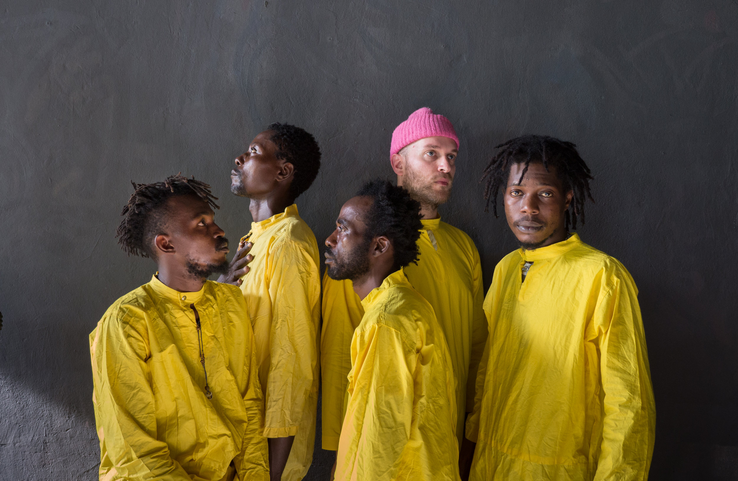 Kokoko ! est le fruit de la rencontre l’été dernier entre Debruit, producteur français basé en Belgique, et ces amoureux de musique et de culture alternative. Boms, Makara, Dido et Bovic avaient toujours voulu enregistrer leur musique de manière plus moderne, mais le manque de matériel ne le leur permettait pas. Invité par La Belle Kinoise, une société de production audiovisuelle qui réalise depuis une quinzaine d’années des lms sur le pays, Debruit se rend au Congo pour la première fois en juillet 2016. Alors qu’ils montent un projet de documentaire autour de la scène artistique underground qui se développe dans les rues de “Kin”, Debruit est appelé en renfort. Pendant deux mois, ils font de la musique, expérimentent, sans savoir exactement ce qu’ils vont en faire. “Fin juillet, après avoir créé des morceaux ensemble, on a fait une bloc party. On est allés dans l’immeuble en construction à côté de là où on bossait. C’était une manifestation spontanée, on n’avait prévenu personne. Quand les performeurs sont arrivés, la rue a été bloquée tout de suite. Tout a pris là, c’était la folie ! Et là, le groupe était créé.