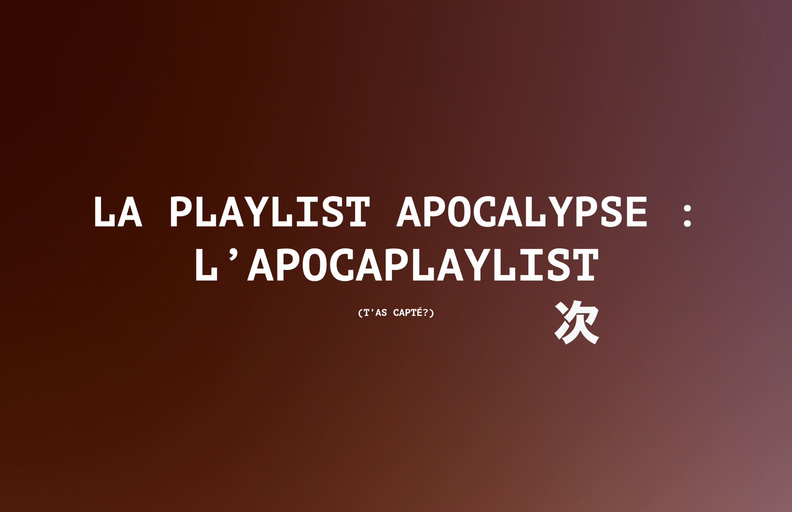 Avec le réchauffement climatique et un été 2022 en proie aux canicules, sécheresses et incendies -top-, une question nous taraude toutes et tous. Comment sera l’été 2023 ? Selon les météorologues, -très- chaud, encore une fois. Il faut se rendre à l’évidence : les prochains seront également brûlants. Il n’y a plus de retour en arrière. Alors pour aller beaucoup mieux et éviter d’instaurer un climat anxiogène, on a imaginé une playlist sur le thème de l’apocalypse : une ‘apocaplaylist’. Une bonne idée ? Ça reste à prouver.