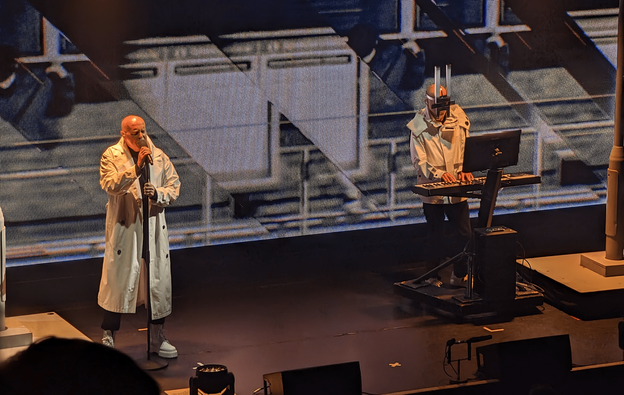 Mais l’attente a été longue. La dernière fois que les Pet Shop Boys avaient voulu jouer à l’Olympia, à l’occasion de l’album Super sorti en 2016, alors que le public était déjà installé, le concert avait été annulé pour non-respect de la législation française sur l’utilisation des lasers en intérieur. Ayant changé de promoteur depuis, le concert de ce jeudi soir, sans laser, mais avec un imposant drapeau ukrainien accueillant la foule pour un show spectaculaire, dans le genre comédie musicale de Broadway version hi-tech venait combler une absence parisienne de dix ans.