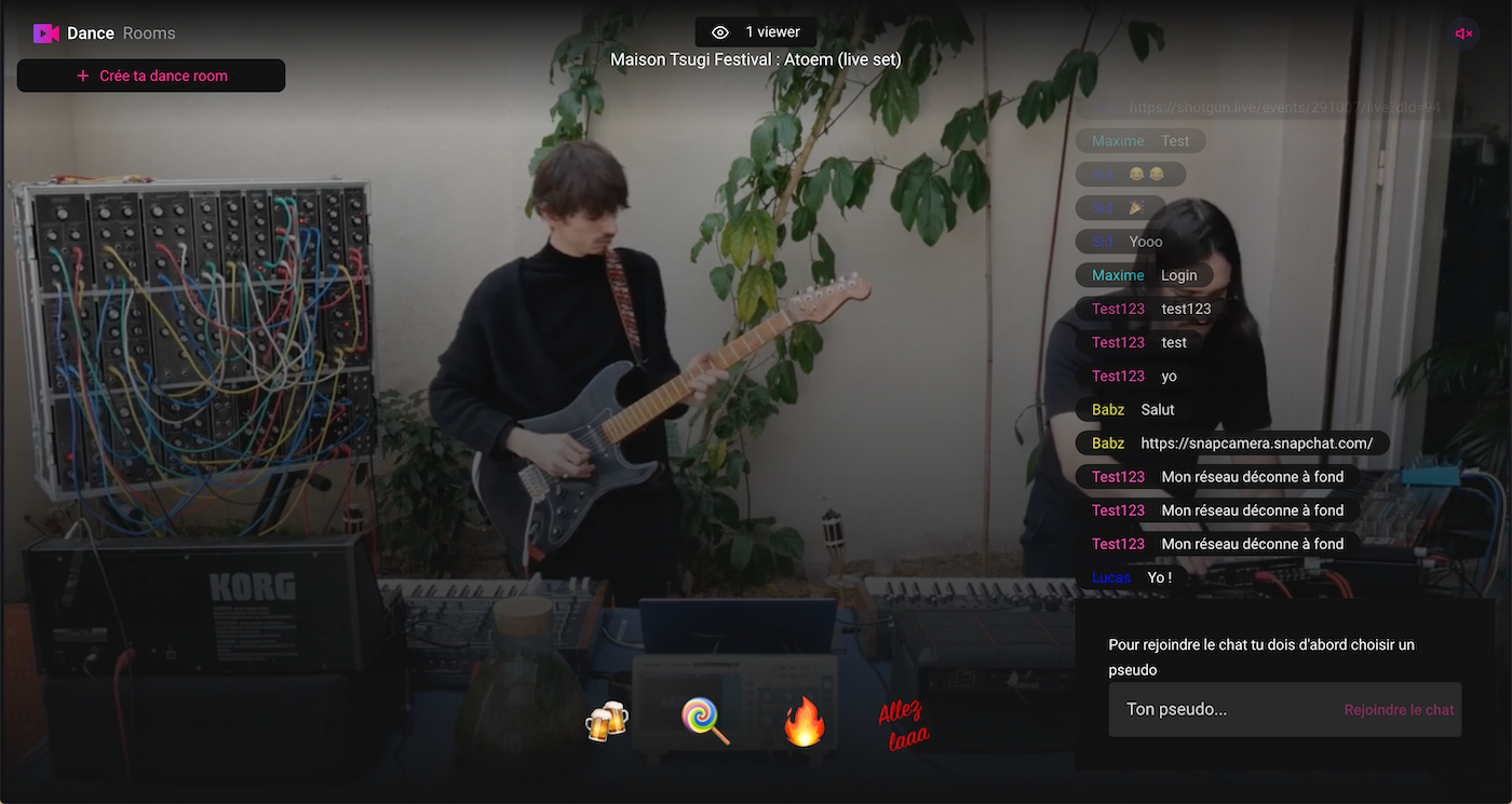 Ces lives sont disponibles en retransmission mais surtout, ils peuvent être suivis en direct sur la plateforme. Shotgun Disdancing joue beaucoup sur l’interactivité. Chaque internaute peut commenter en direct le set en cours. Mieux, la plateforme a mis en place une interface où il est possible de créer des « dance room » privées avec ses proches afin de pouvoir suivre en direct et danser ensemble à distance.