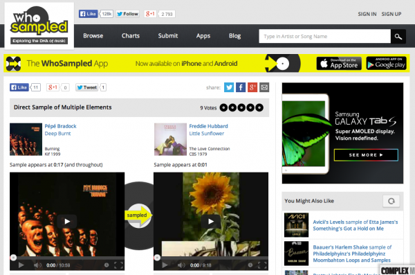 Pour les curieux qui se demandent d’où provient tel ou tel échantillon sonore dans un morceau, il existe WhoSampled, un site très pratique et bien pensé qui les répertorie et les classe. L’engouement est total et à mesure que les références musicales s’étoffent sur le site, le nombre de visites croît jusqu’à atteindre cet automne le million de visiteurs mensuels sur le site. Déclinée en 2012 pour iPhone, l’application Android, gratuite, vient d’être mise en ligne en début de semaine sur le Google Play.